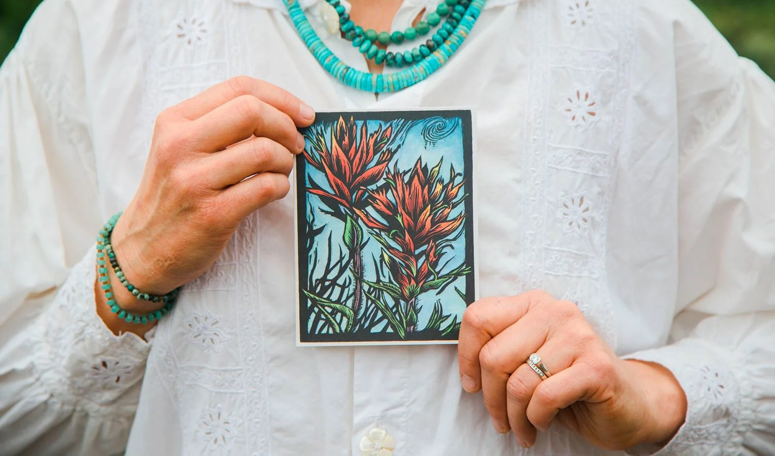 Send your friend, your sweetie, or your family member a beautiful, bold, handcrafted notecard today…blank inside for your own message. 100% recycled paper, printed in Montana.